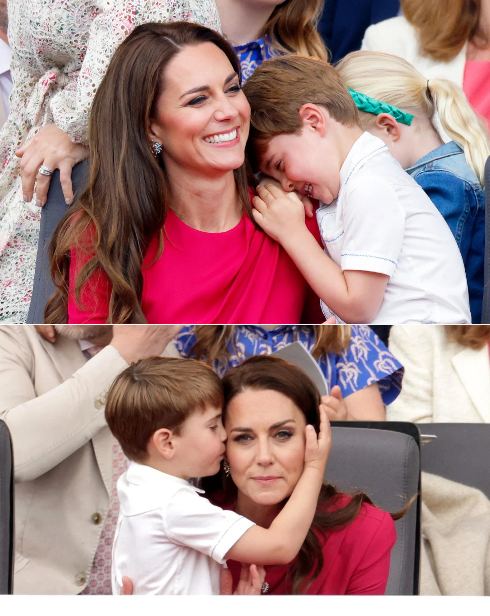 In one of the most endearing snapshots from Queen Elizabeth II’s Platinum Jubilee celebrations, four-year-old Prince Louis captured hearts worldwide by giving his mother, Kate Middleton, a tender kiss during the grand pageant on June 5, 2022. The event, held outside Buckingham Palace in London, marked the finale of a four-day extravaganza honoring the Queen’s 70 years on the throne. Amid a sea of performers, celebrities, and patriotic displays, the young royal’s affectionate gesture toward his mum stood out as a beacon of family warmth, reminding everyone that even in the midst of historic pomp, childhood innocence reigns supreme. Louis, seated in the royal box with his family, leaned in for the kiss, his small hand gently touching Kate’s face, creating a moment that quickly went viral and melted social media feeds.