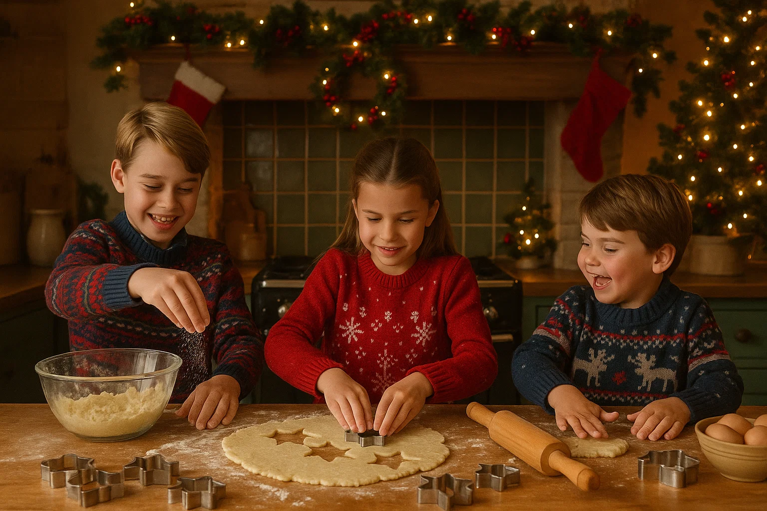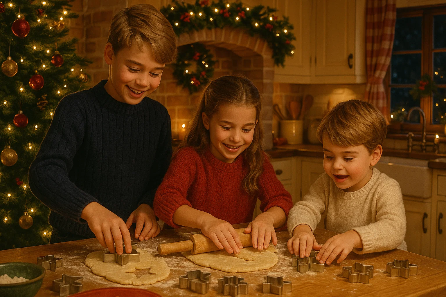 Imagine the scene: sunlight filtering through frost-kissed windows, casting a golden glow on a flour-dusted kitchen island. The royal children, sleeves rolled up and aprons askew, transform the lodge’s state-of-the-art kitchen into a pint-sized patisserie. Giggling echoes bounce off the beamed ceilings as tiny hands knead dough, shape stars and snowmen, and drizzle icing with wobbly precision. George, ever the steady eldest, leads with a focused sprinkle of cinnamon; Charlotte adds her artistic flair to candy cane swirls; while Louis, the mischievous spark, sneaks extra chocolate chips, his laughter bubbling like a pot on the stove. Princess Catherine, radiant in a simple knit sweater, guides them with gentle nudges, her own hands dusted white like fresh snow. Prince William, feigning expertise after his famously “disastrous” baking attempts shared during past engagements, joins in with mock-serious flour tosses that leave everyone in stitches.