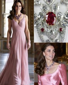 A Night of Royal Elegance: Princess Catherine’s Stunning Pink Gown and Timeless Ruby Necklace Steal the Show