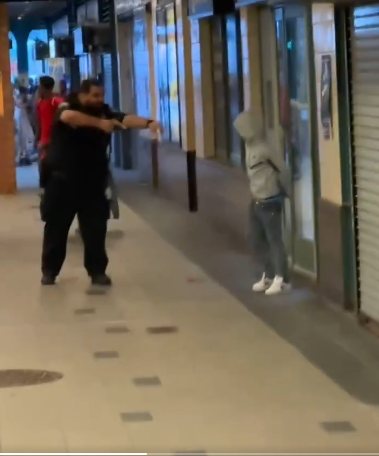 A tense and dramatic moment unfolded at a local shopping plaza yesterday afternoon when a 15-year-old teenager brandished a knife during an argument — only to be confronted by an off-duty police officer who drew his service weapon and quickly deescalated the situation.